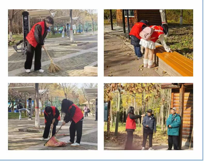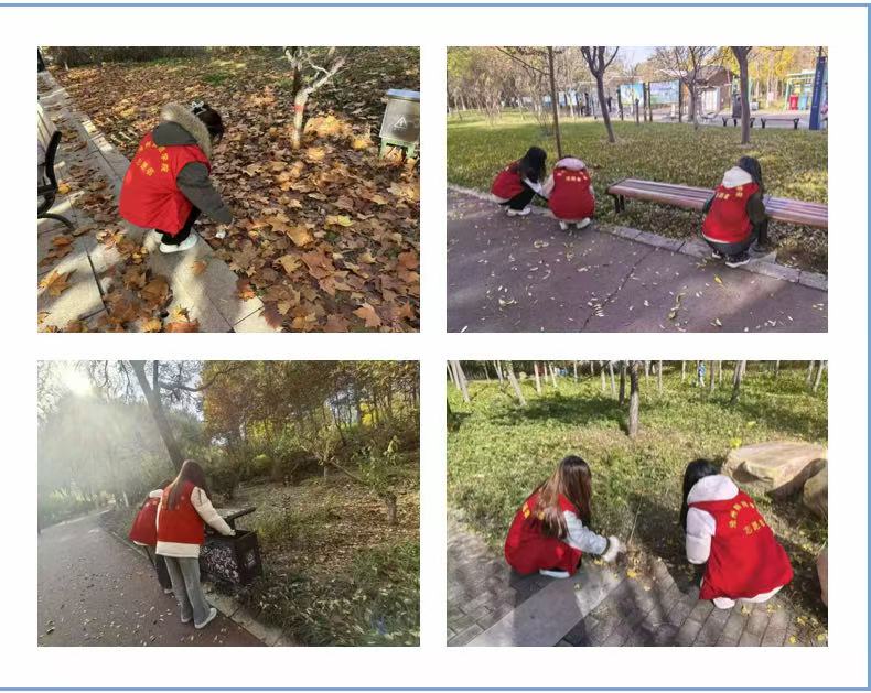 志愿服务期间,志愿者们在负责人的统筹安排下有序开展工作:大家分工协作细心清理园区步道的杂物落叶,捡起地上的垃圾,协助整理维护园区整洁,每一处角落都留下了认真忙碌的身影。