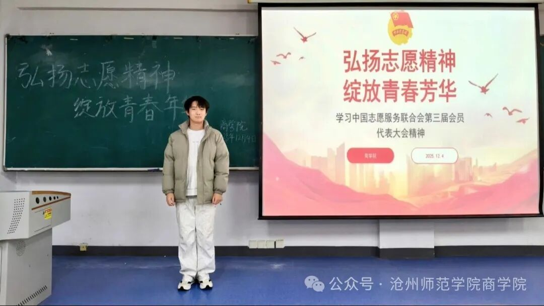 为引导团员青年将个人成长融入时代洪流,以实际行动诠释志愿精神,商学院开展“弘扬志愿精神,绽放青春芳华”主题团课,本次团课由25级酒店管理一班团支书马明硕同学主持,25级全体同学参加。