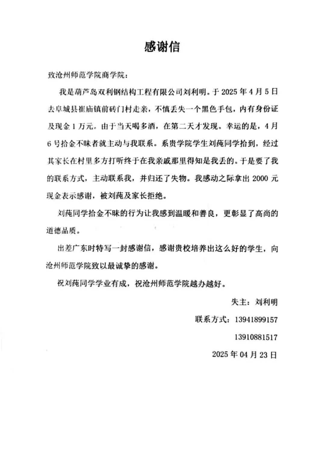 失主被刘莼同学的行为深深打动,特意给学校寄来了感谢信,信中对刘莼的高尚品德给予了高度赞扬。
