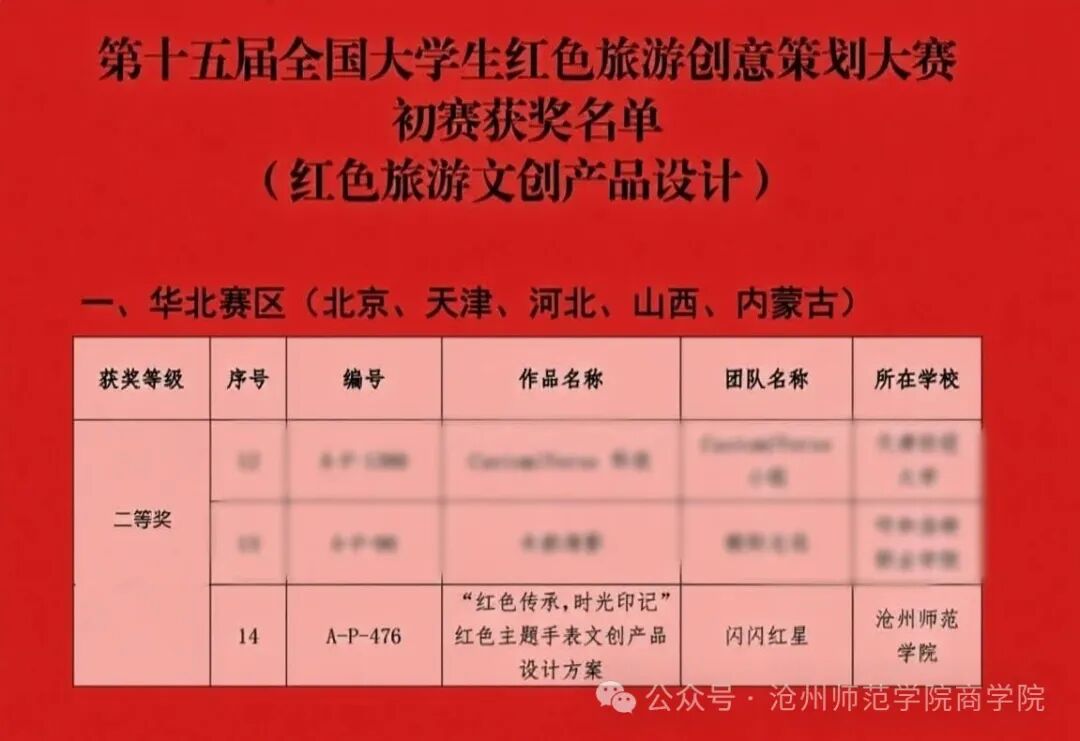 (图片为第十五届全国大学生红色旅游创意策划大赛初赛获奖名单(红色旅游文创产品设计),显示华北赛区(北京、天津、河北、山西、内蒙古),其中二等奖里有编号A - P - 476、作品名称“红色传承·时光印记”红色主题系列文创产品设计方案、团队名称“闪闪红星”、所在学校“沧州师范学院”的相关信息)
