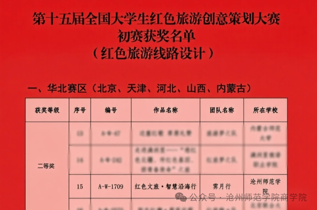 (图片为第十五届全国大学生红色旅游创意策划大赛初赛获奖名单(红色旅游线路设计),显示华北赛区(北京、天津、河北、山西、内蒙古),其中二等奖里有编号A - W - 1709、作品名称“红色文旅·智慧沿海行”、团队名称“霁月行”、所在学校“沧州师范学院”的相关信息)