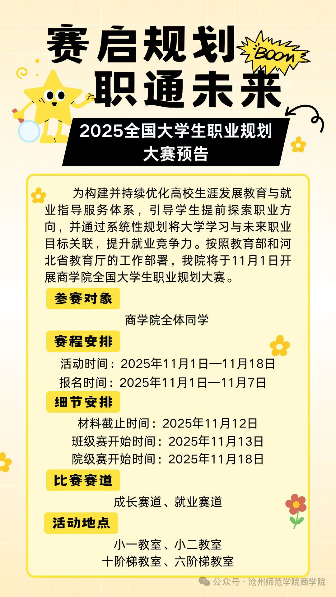 为构建并持续优化高校生涯发展教育与就业指导服务体系,引导学生提前探索职业方向,并通过系统性规划将大学学习与未来职业目标关联,提升就业竞争力。按照教育部和河北省教育厅的工作部署,我院积极承办2025年全国大学生职业规划大赛。我院将于11月1日开展商学院全国大学生职业规划大赛班级赛的评选。